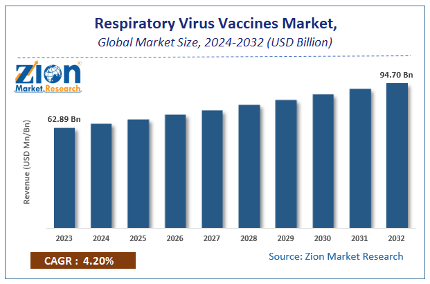 The global respiratory virus vaccines market is expected to experience significant growth over the next several years. In 2023, the market size was estimated at approximately $62.89 billion, and it is projected to reach around $94.70 billion by 2032, growing at a compound annual growth rate (CAGR) of 4.2%.